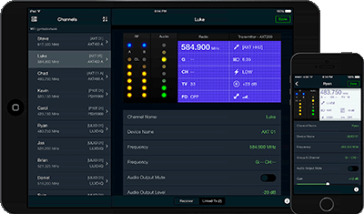 For a one-time fee per wireless product line, receiver and transmitter settings, such as frequency assignment, audio input/output levels, channel and device naming, and menu locking, can be adjusted from any Android device, as well as iPad, iPhone, or iPod.