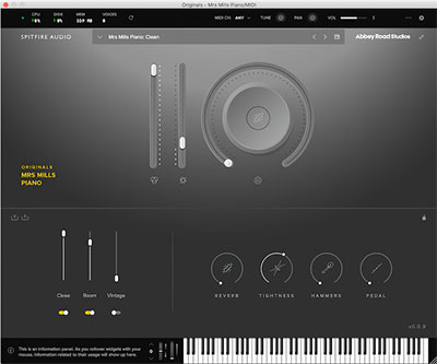 It is possible to tailor Spitfire Audio’s Originals Mrs Mills Piano plug-in thanks to its range of signals, presets, and controls. These comprise Close (with a pair of Neumann U67 mics for a crisp, defined sound) and Room (pairing omni condenser microphones to give a spacious image of the piano and the room) controls are joined by a Vintage signal capturing the classic Sixties-vintage Abbey Road use of a AKG D19c microphone placed above the strings in the middle of the piano, recorded using an all-valve Studer J37 tape machine made famous by breakthrough multitrack recording of The album via an EMI REDD.47 mic preamp.