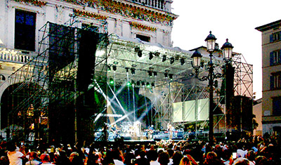 Staged in the Piazza della Loggia, Brescia’s picturesque Renaissance square, the festival used an Outline loudspeaker system, supplied by local rental company, Cipiesse. ‘The PA was made up of nine Outline GTO C-12 modules per side plus three Outline Mantas on down fill for the front rows of seats, which were close to the stage,’ festival audio chief Giancarlo Paladini explains. ‘We used eight DBS 18-2 subs per side, and four LIPF 082 on front fill.